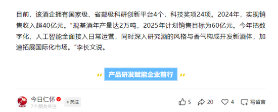 据仁怀市融媒体中心“今投仁怀”公众号消息,国台酒业副总经理、总工程师李长文表示,2024年,国台酒业实现销售收入超40亿元,目前基酒年产量达2万吨,2025年计划销售目标为60亿元,业绩不进则退。